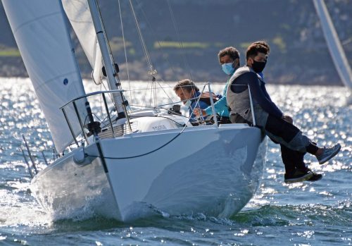 Baiona, 10 de octubre de 2020 .- Javier de la Gándara convirtió esta tarde al Okofen en primer líder de la Liga de Otoño de la clase J80 tras haber vencido en la jornada inaugural celebrada en aguas de la bahía de Baiona. El velero, patroneado por el histórico regatista y tripulado por su equipo habitual, firmó primeros puestos en todas las pruebas celebradas y ese pleno los colocó directamente al frente del campeonato de monotipos organizado por el Monte Real Club de Yates.