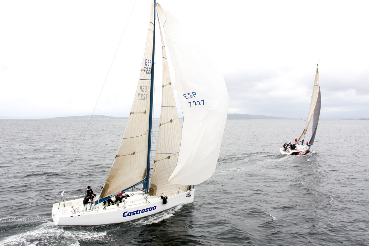 La tregua de la lluvia y un viento de oeste de 10-12 nudos permitieron una salida enormemente vistosa de los barcos más poderosos. El “Gran Jotiti” (Enrique Cortina, MRCY Baiona) y el “Viña Mein” (José Raimundo Torres, CN Punta Lagoa) ofrecían toda su formidable eslora mientras que “Sirius V”, el barco de la Armada que patronea Fernando Cominges, y el “Castrosúa” (Willy Alonso, RCN Vigo) hacían una buena salida.