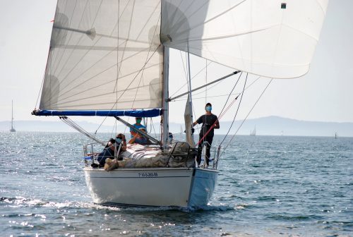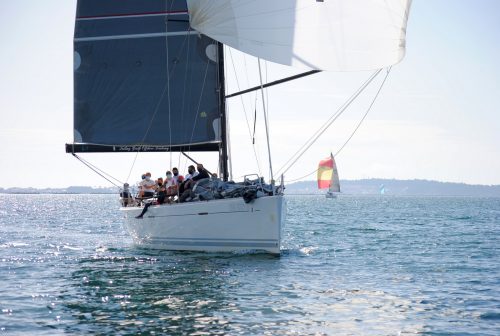 .- VILAGARCÍA, 19 DE SEPTIEMBRE DE 2020 Una hora y media hubo de esperarse para poder dar comienzo a la XXIV Regata Almirante Rodríguez Toubes de cruceros, ya que el viento en la ría de Pontevedra a la hora prevista de salida, las 11:30, era totalmente inexistente, con lo cual el comité de regata optó por desplazar la línea de partida casi tres millas hacia la salida de la ría y a las 13:00 a la altura de la baliza de Morrazán al través de Sanxenxo, conseguía iniciar esta primera etapa con viento del suroeste de 8 nudos y cuya componente se mantuvo ya toda la tarde hasta llegar a Vilagarcía, eso sí, aumentando hasta los 12-14 nudos en muchas ocasiones, de forma que los barcos con rumbos portantes fueron rapidísimos hasta la meta completando 21,8 millas de las 25,5 previstas inicialmente.