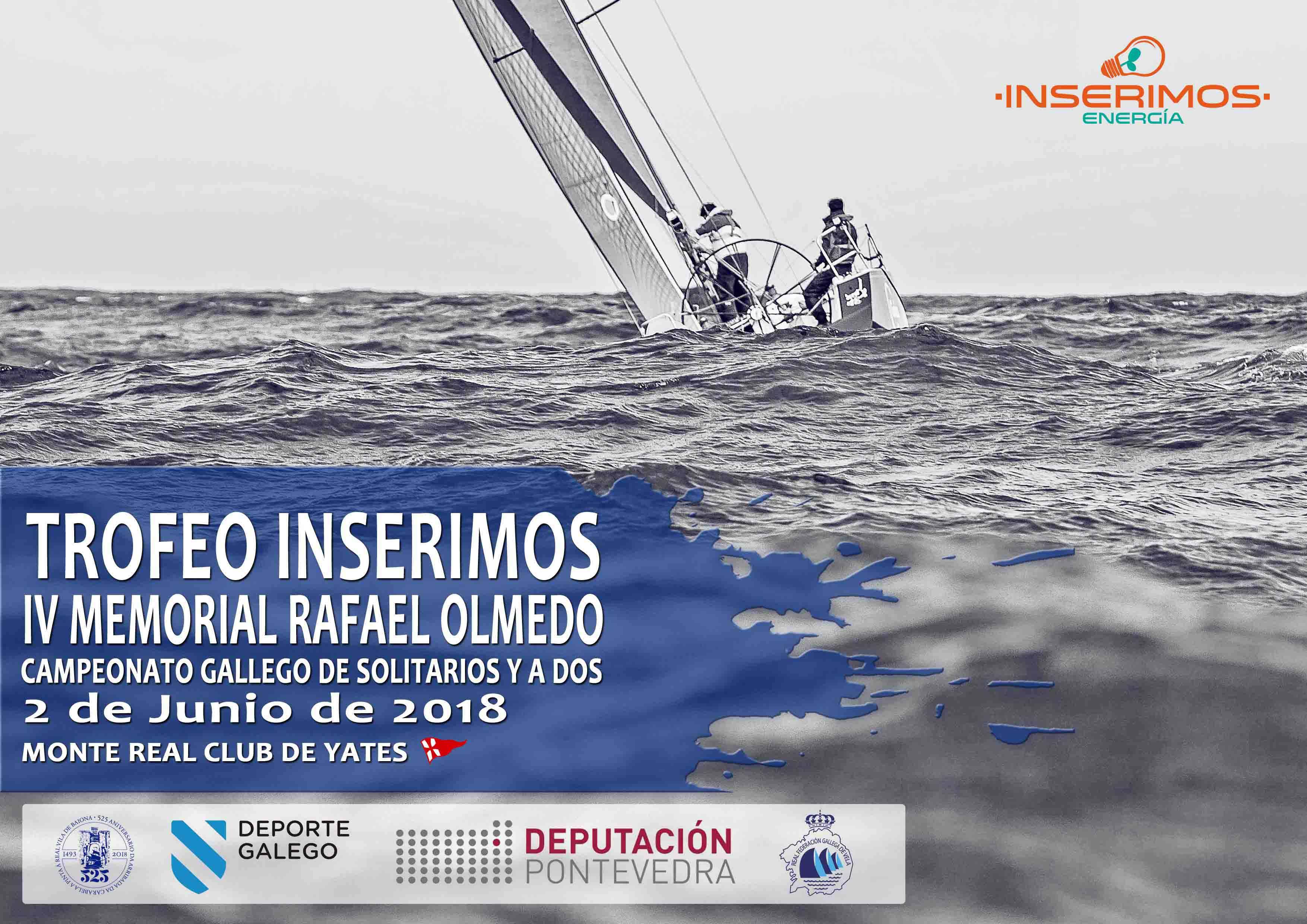 Baiona, 29 de mayo de 2018 .- El Monte Real Club de Yates volverá a organizar, un año más, el Campeonato Gallego de Solitarios y a Dos, que se celebrará el próximo sábado en aguas de las Rías Baixas patrocinado por Inserimos Energía y dedicado al que fue presidente del club durante más de 40 años, Don Rafael Olmedo Limeses.