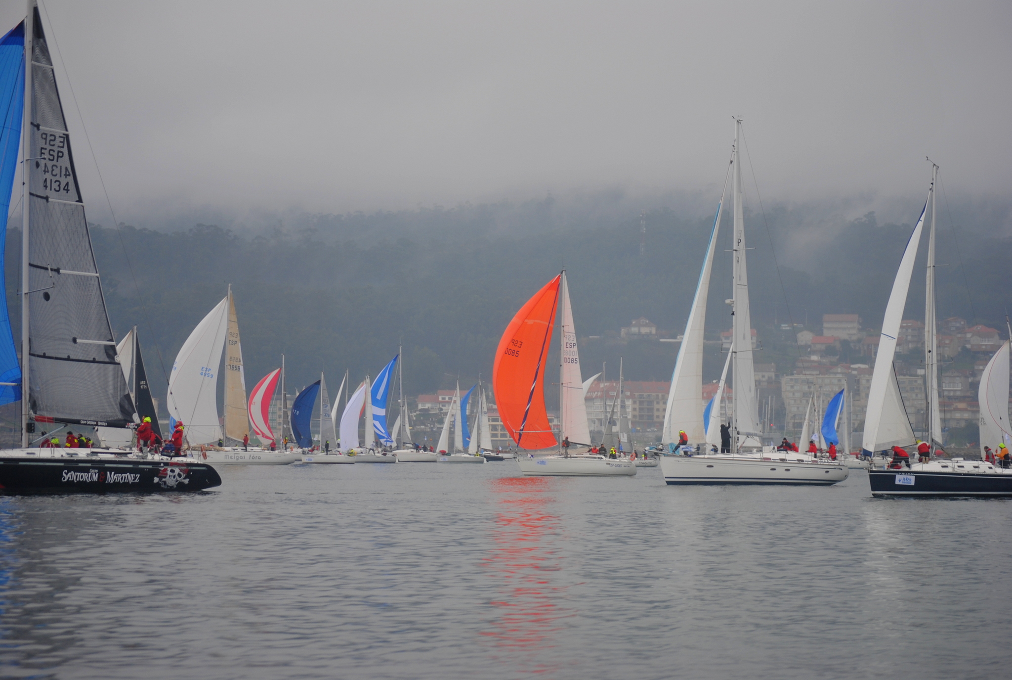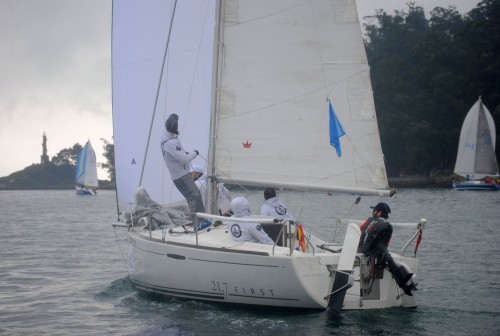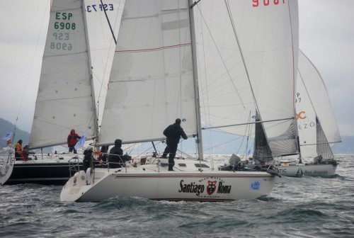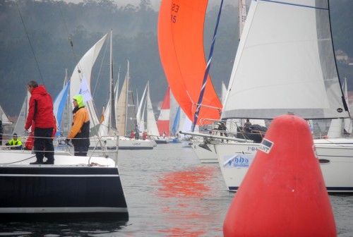 Una hora tuvieron que esperar los 51 barcos participantes al este de la isla de Tambo bajo una incómoda “poalla” y sin viento, hasta que a las 15:35 horas el Comité se decidió a dar la salida con una brisa del Nordeste y con el conocimiento de que en el centro de la ría estaban teniendo el viento previsto el suroeste, de unos 10 nudos, pero que estaba tardando en llegar. Salida directa, sin baliza de desmarque y en rumbo de popa muy igualada y espectacular en pelotón casi compacto hasta la boca sur de la isla, prácticamente en la desembocadura del río Lérez para realizar un recorrido virando una baliza en el centro de la ría, de 10,5 millas la flota orc y de 6,5 millas los clásicos, veteranos y mini 23.
