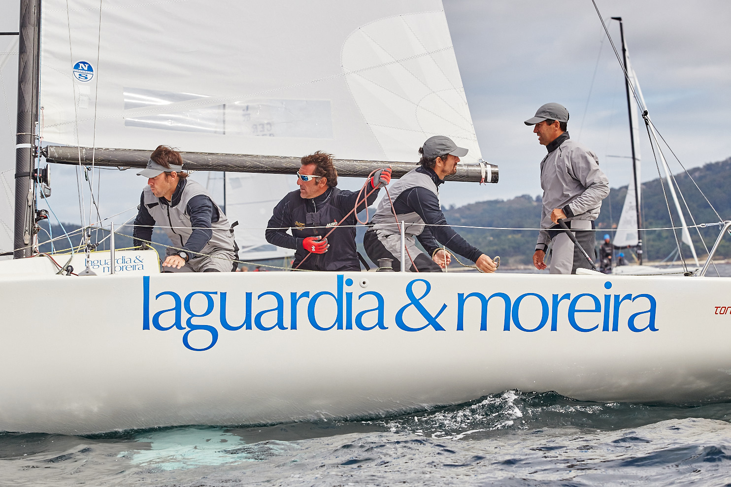 La flota solo pudo completar dos pruebas porque el viento no se mostró hasta mediodía. Pasaban tres minutos de las doce cuando los J70 empezaban la primera regata, cuyo podio fue para el “Abril Verde” (Luis Pérez Canal, RCN Vigo), que enseñaba sus garras, seguido por “Sailway Solventis” (Malalo Bermúdez de Castro, CN Ría de Ares) y por el “Joyfull” (Denis Cherevatenko, DC Team).