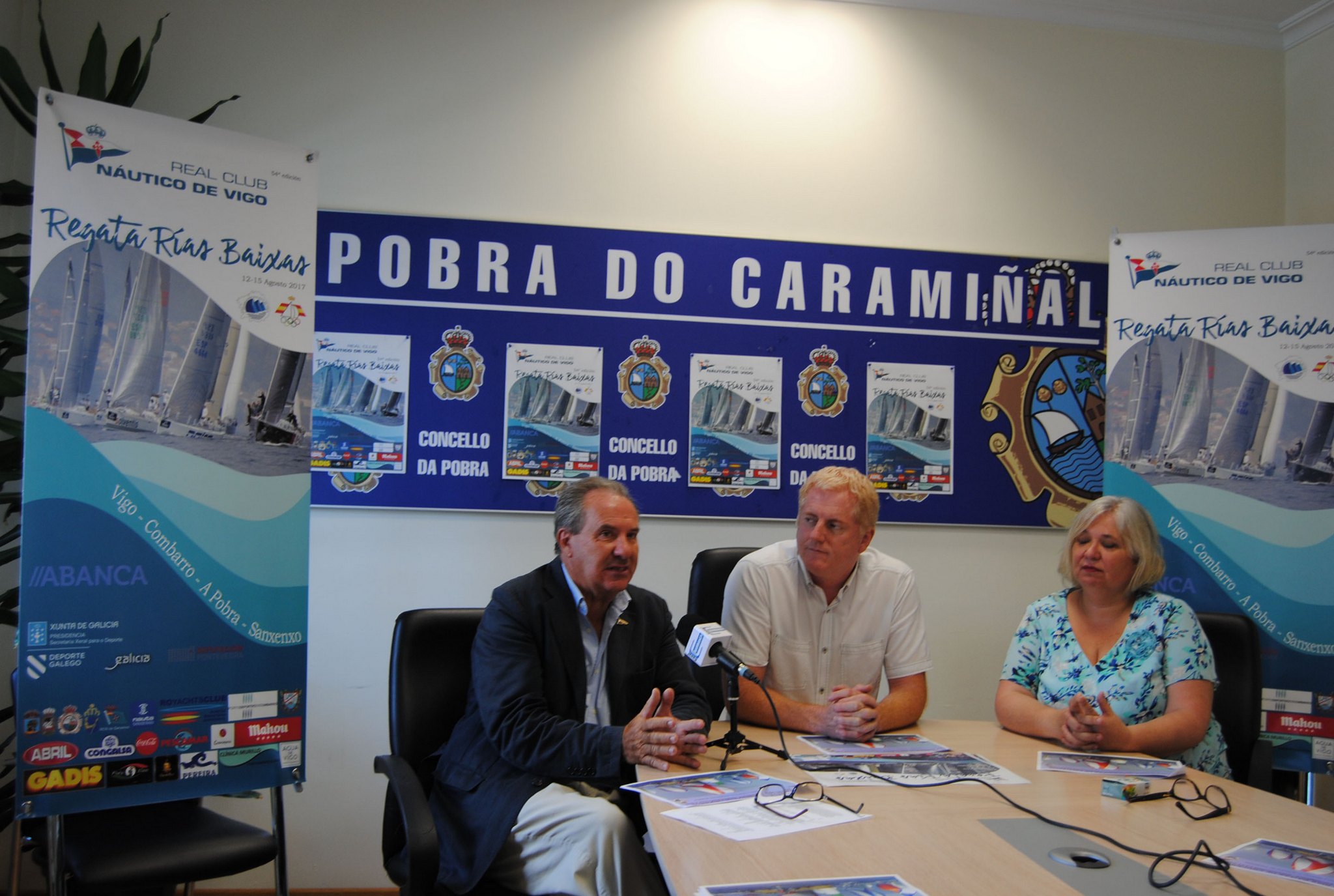 El Alcalde de A Pobra, Xosé Lois Piñeiro presentando la Regata ante los medios. A su izquierda le acompañan, la Conselleira de Turismo, Charo Varela y a su derecha el Vicepresidente del RCN Vigo, José Antonio Portela.