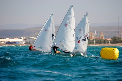 La vela Ligera, como decíamos, estuvo muy animada y ofreciendo imágenes espectaculares entre la mar tendida de la costa, con un viento que osciló entre los 9 y 14 nudos del nordeste. 31 Laseristas y 11 catamaranes se dieron cita dando un gran colorido a la jornada.
