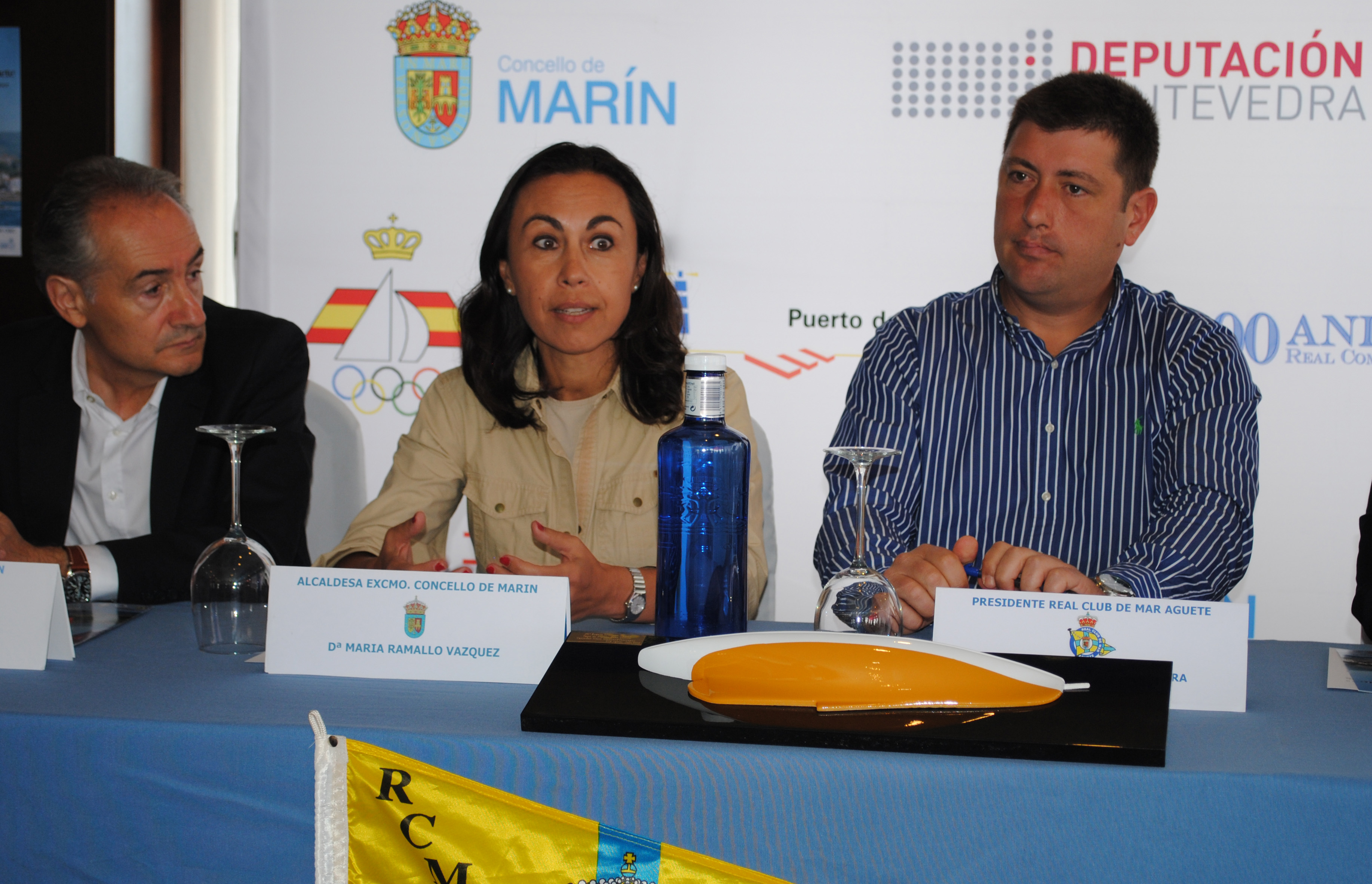 La Alcaldesa de Marín, María Ramallo, dirigiéndose a los presentes, a su derecha el presidente del Puerto de Marín, José Benito Suárez Csota y a su izquierda, Manolo Torres, presidente del RCM Aguete – © Desmarque s.l.
