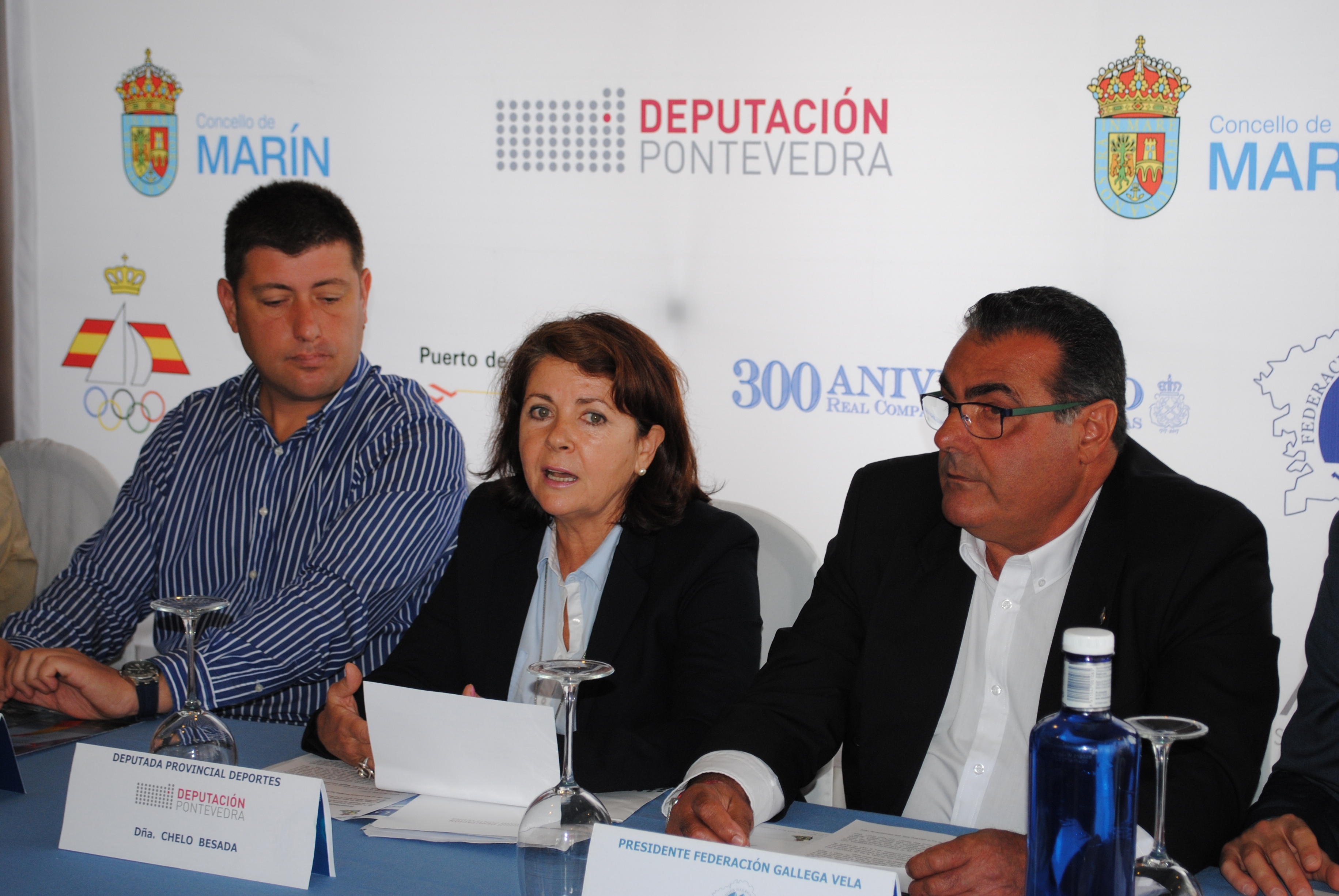 La diputada de deportes de la Deputación de Pontevedra Chelo Besada dirigiéndose a los presentes, a su izquierda Manuel Villaverde, presidente de la Federación Gallega de vela – © Desmarque s.l.