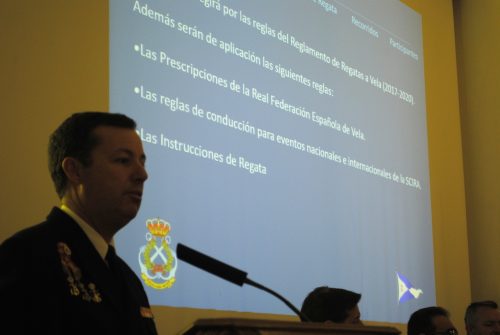 El Director de la ENM, D. Jose María Núñez Torrente, presentando la regata a los medios. De izquierda a derecha D.Javier Sánchez, jefe de estudios de la ENM, le sigue el presidente de la Real Federación Gallega de Vela, Manuel Villaverde. En el centro el comandante director de la ENM D. José Mª Núñez Torrente, le acompaña el gerente de la empresa Dibay Ignacio Santiago Montes y D. Juan García García jefe de instrucción de la ENM – Foto © Desmarque sl