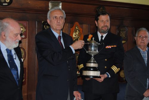 el trofeo Almirante Rodriguez Toubes, donde se inscriben los ganadores, sostenido por el presidente del RCR Galicia a la izqda, y el presidente de la Comisión Val de Regatas de Marín a la decha