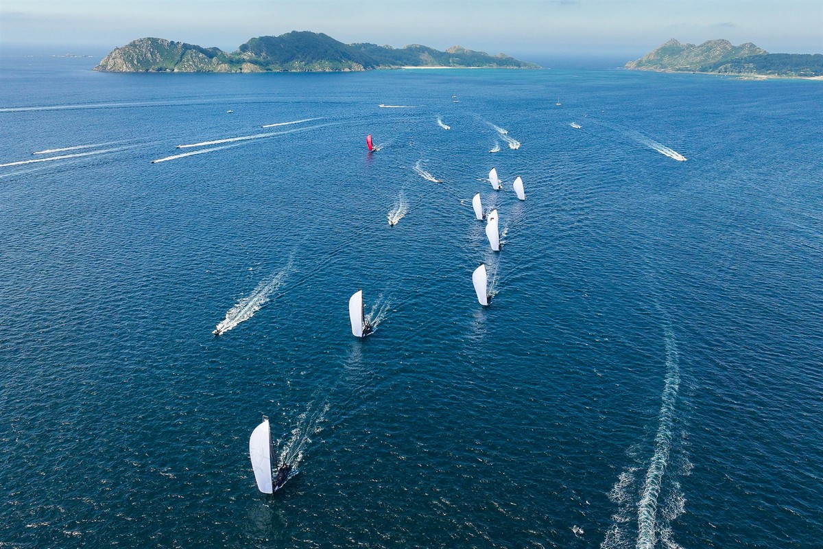 El viento se portó con la flota y, tras un aplazamiento inicial en el campo de regatas situado frente a las islas Cíes, el Comité pudo dar la salida en torno a la una y media a la primera de las cuatro pruebas que se disputarían a lo largo de la tarde.