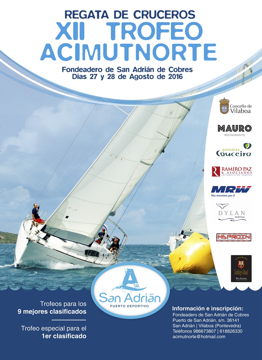 XII Trofeo Acimut Norte, San Adrián de Cobres, ORC y 23 Pies Facebook Twitter Google+ XII Trofeo Acimut Norte ORC Crucero y Cruceros hasta 23 Pies Puerto Deportivo San Adrián 27 y 28 de Agosto 2016 Anuncio de Regata Cobres 2016 Boletín Inscripción Cobres 2016 Instrucciones de Regata Cobres 2016 Inscritos y clasificaciones de Regata Cobres 2016 Galería de Fotos Acimut Norte 2016 Facebook Twitter Google+